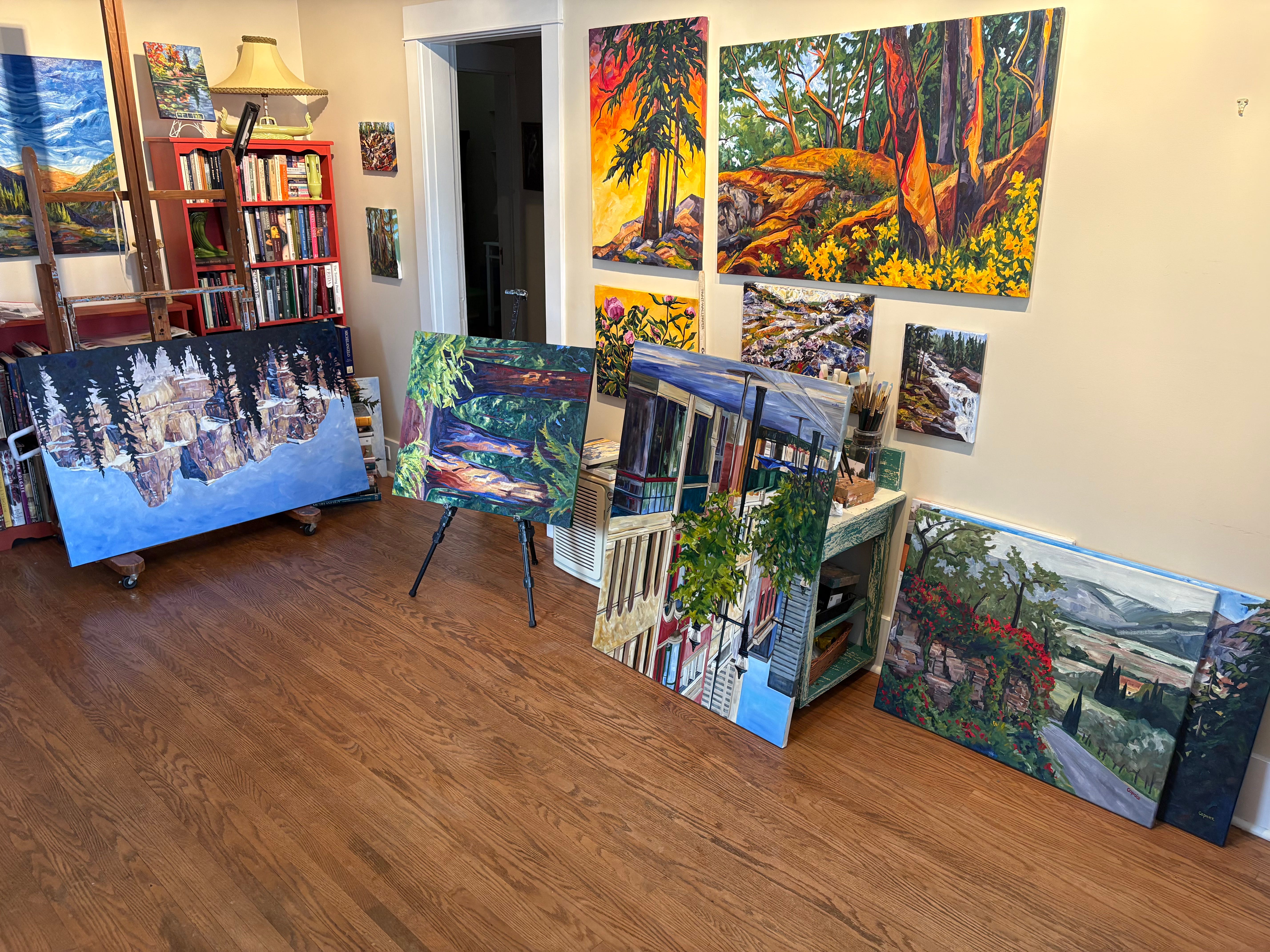 The exhibition called “Time After Time” will be a retrospective of my career over the past 25 years. It has been a thrill to spend time with some of my paintings that I painted decades ago. They feel like they were from another life. These pieces have taken me on a journey through my past. Looking at them all together, I see much of my life. Memories of trips come flooding back to me; the joy of being lost with Mom in Umbria, touring around Crawford Bay and painting in Riondel, a week spent in Banff, a day trip with my Dad to Kananskis, visiting the Glenbow Museum to see the Group of Seven exhibit with Mom and cousin Penny, a drive through the old growth forest to Island Lake with brother Dave, seeing Bootleg Mountain for the first time when Mom and I moved to the Kootenays in 1997. Yes, looking at these paintings are glimpses of my life history.